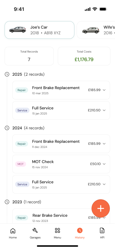 Log every service, repair and MOT in one place. Attach costs, notes and dates so you always have a complete picture of your vehicle's history — and a compelling record when it comes time to sell.