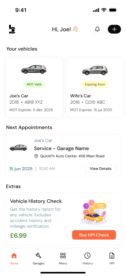 Run a full HPI check directly inside the app. Find out if a vehicle has outstanding finance, has been written off, or has a hidden past — all without leaving DriverMate.